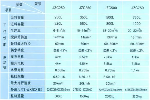 本系列攪拌機(jī)包括JZC250、350、500和750四種主要機(jī)型,其中JZC750型為固定式,除作為單機(jī)使用外,還可與配料機(jī)組合成簡易式攪拌站。其余機(jī)型均為移動式。
